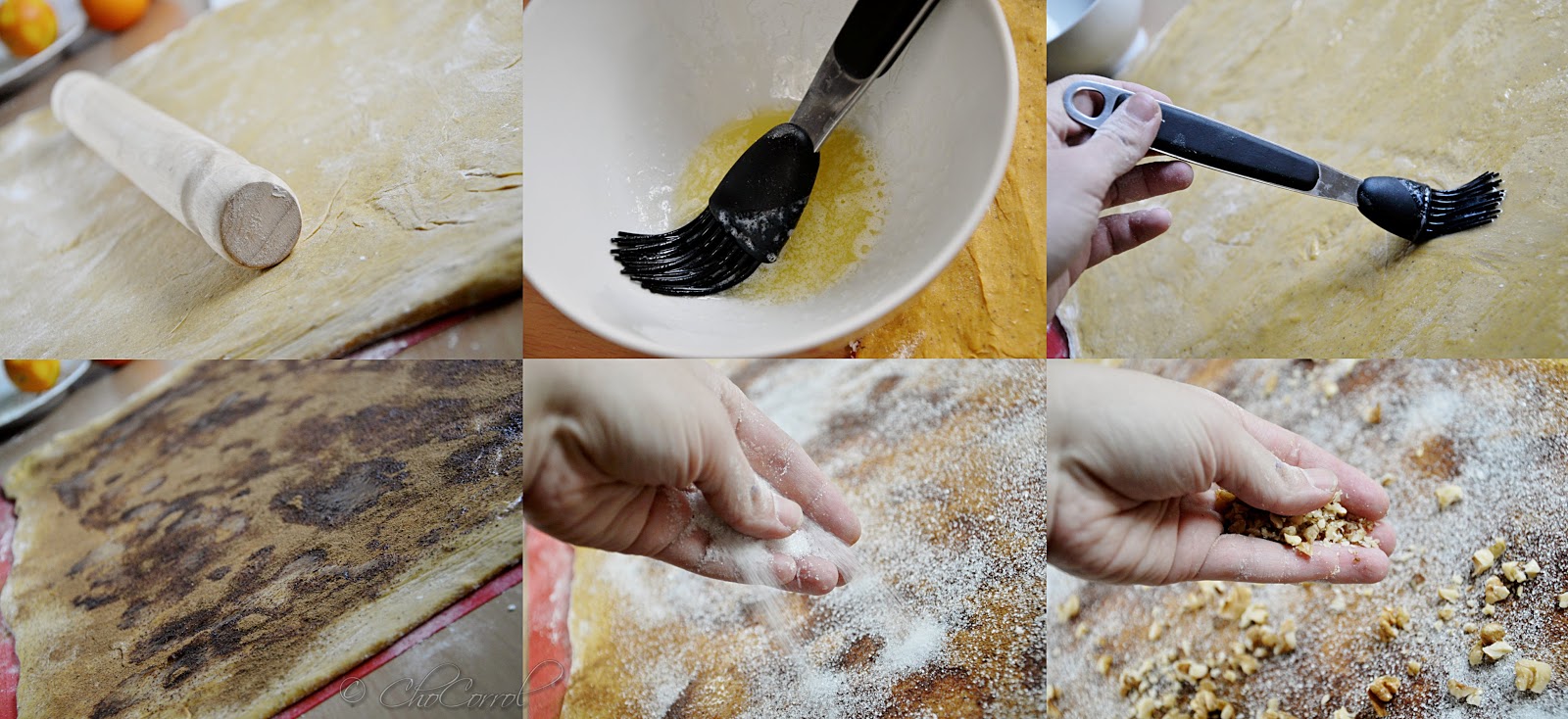 roll out the dough. brush it with the melted butter and sprinkle with cinnamon, sugar and chopped nuts.